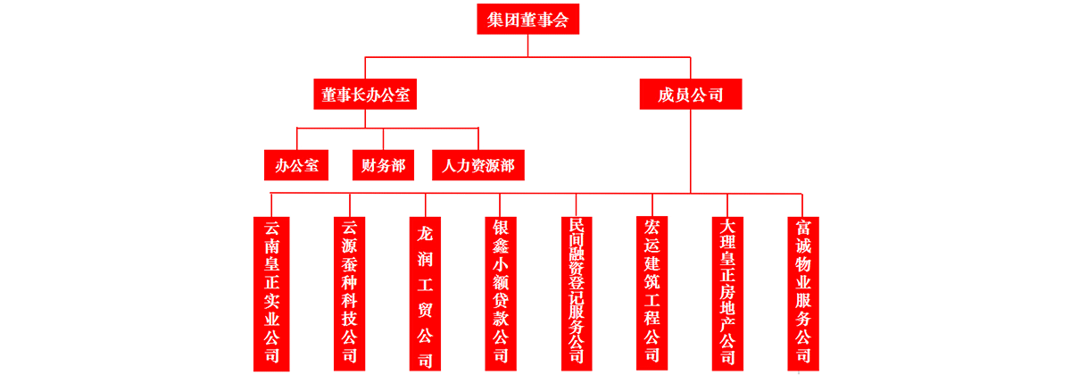 皇正集團(tuán)母公司為云南皇正實(shí)業(yè)集團(tuán)有限公司,是云南省農(nóng)業(yè)產(chǎn)業(yè)化重點(diǎn)龍頭企業(yè),主要從事蠶桑種養(yǎng)、蠶繭收烘,白廠絲和絲綿制品加工銷售。主要產(chǎn)品有生絲、蠶絲被以及絲綿制品。旗下子公司有祥云縣龍潤工貿(mào)有限公司,主要從事硫酸生產(chǎn)、鋅焙砂加工、硫鐵礦加工銷售;祥云縣宏運(yùn)建筑工程有限公司,具有二級(jí)建筑資質(zhì),主要從事房建工程、市鎮(zhèn)工程、農(nóng)田水利工程以及各類土石方工程施工;大理皇正房地產(chǎn)有限公司(原祥云縣金宏房地產(chǎn)開發(fā)有限公司),從事房地產(chǎn)開發(fā)與置業(yè),在縣內(nèi)開發(fā)建設(shè)了花鳥市場(chǎng)、彩云居、理想家園等住宅小區(qū);大理州云源蠶種科技有限公司,從事蠶種生產(chǎn)、銷售;祥云縣銀鑫小額貸款有限公司,主要從事縣內(nèi)各項(xiàng)小額貸款;財(cái)務(wù)咨詢業(yè)務(wù);祥云銀龍民間融資登記服務(wù)有限公司,主要提供投融資項(xiàng)目咨詢、投融資策劃、投融資對(duì)接、交割監(jiān)督等服務(wù);祥云縣富誠物業(yè)服務(wù)有限公司從事物業(yè)管理。成員單位為祥云縣蠶桑協(xié)會(huì),是一個(gè)在龍頭企業(yè)帶動(dòng)下建立起來的協(xié)會(huì),有會(huì)員1萬多個(gè),是大理州農(nóng)技協(xié)聯(lián)合會(huì)團(tuán)體會(huì)員。協(xié)會(huì)建立了由公司、站、中心輔導(dǎo)員、小蠶共育戶四級(jí)組成的科技推廣服務(wù)體系,主要從事縣內(nèi)蠶桑生產(chǎn)技術(shù)推廣及服務(wù)。